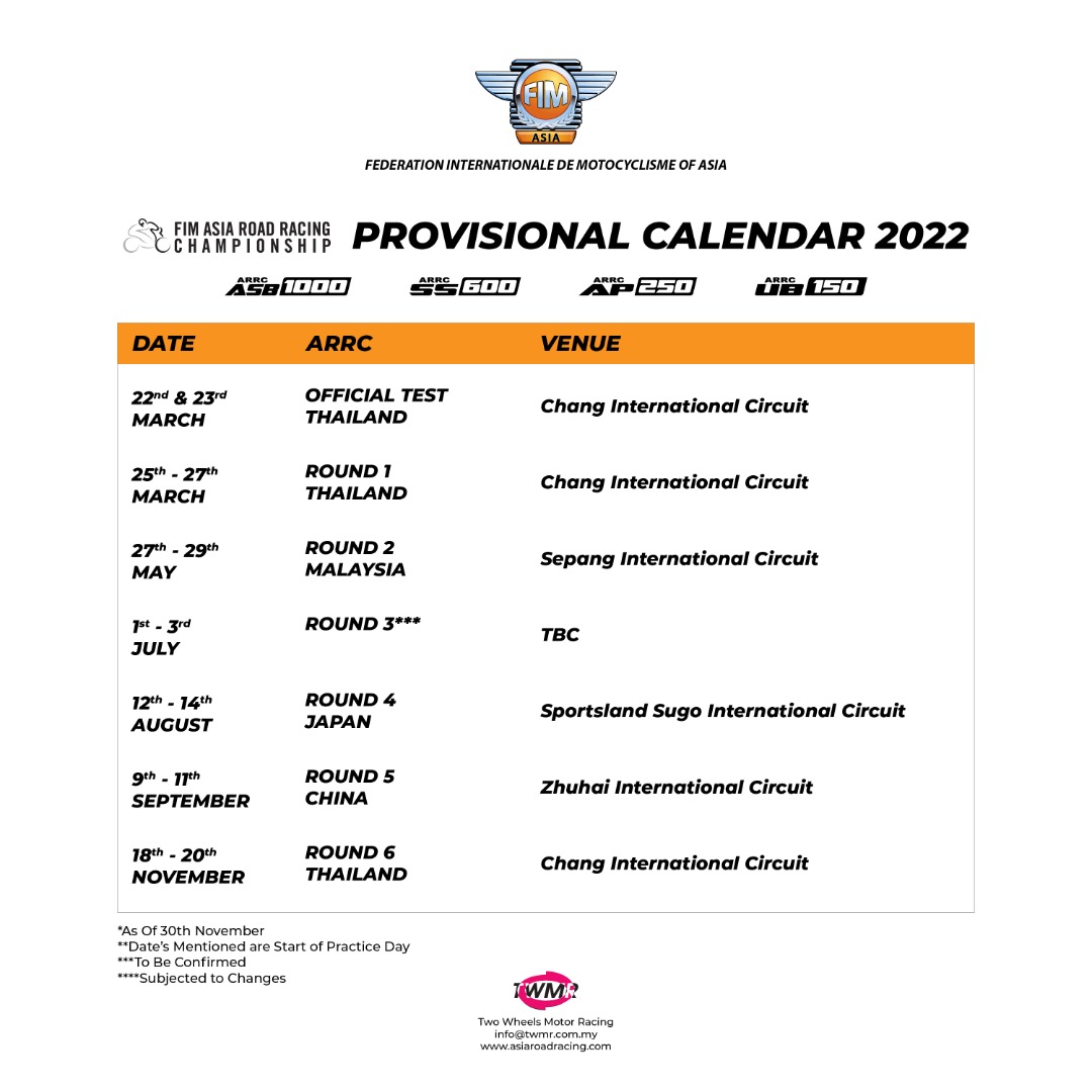 The FIM Asia Road Racing Championship is excited to announce the 2022 calendar as follows: