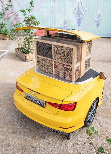 The project’s second second-life product – an insect hotel in a bright yellow Audi S3 – is also drawing admiring comments. To build it, the trainees split an old model down the middle and cut it apart, took out the sharp objects, installed a large block of wood, and put a yellow hood on the new insect habitat.