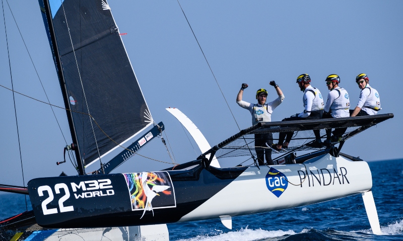 Finally in today’s sixth and last race, a chink in the Bliksem armour appeared when Richard Göransson’s Inga from Sweden held the Dutch/US team up at the start to lead into the reaching mark. Inga from Sweden, which has joined the M32 European Series this season, led for the next lap until the final beat, when, in a four way fight to be first into the final reaching mark, it was Ian Williams’ GAC Pindar team that popped out in front.