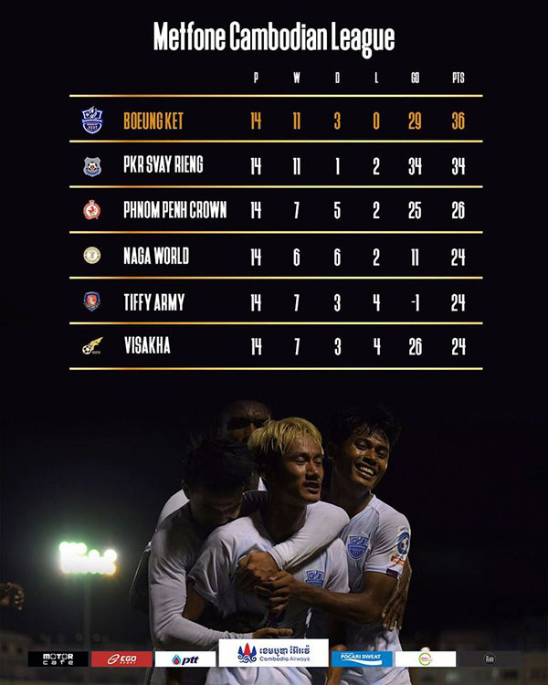 The one point was enough to let Boeung Ket stay top of the standings with 36 points – two points ahead of second-placed Preah Khan Reach Svay Rieng who this week disposed of Tiffy Army 5-2.