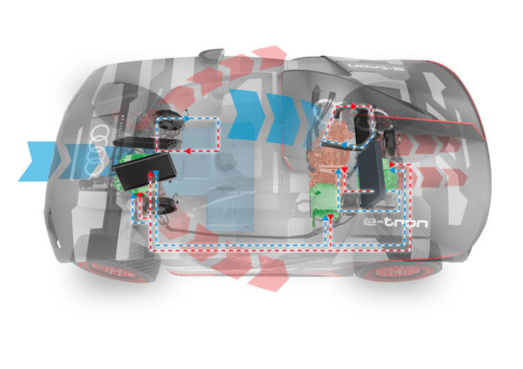 The heart of the electric drive is the high-voltage battery system. To keep it at the right temperature, Audi uses a coolant called Novec, which does not conduct any electric currents. This low-temperature circuit has a radiator under the front hood.