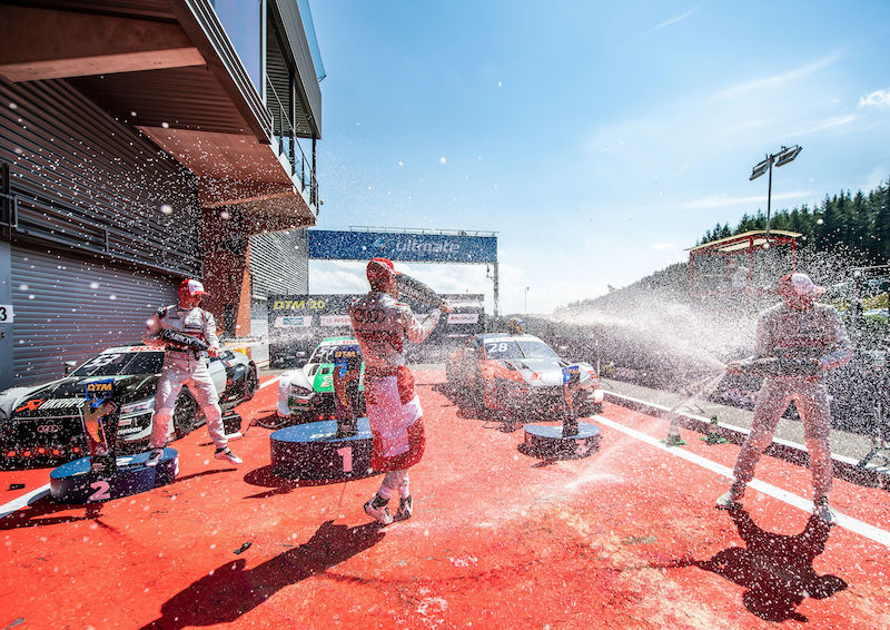 “This result is simply fantastic for Audi,” said Head of Audi Motorsport Dieter Gass. “After the tests before the season we didn’t expect this. Today was all about good tire management – and Nico Müller was simply in a class of his own.” The Swiss started into the 2020 DTM on Saturday morning with a fastest time in the wet free practice session. In qualifying, he narrowly had to admit defeat only to his teammate Robin Frijns, who secured his first pole position in the DTM. In the race, Müller fended off an attack by René Rast in the famous Eau Rouge corner shortly after the start. On lap five he passed his teammate Robin Frijns on the long uphill straight and then gradually pulled away from the rest of the field. At the finish, Müller had a lead of almost 20 seconds – a small world in the DTM. “Being able to climb onto this special podium with the Swiss flag on the Swiss National Day makes me very proud,” said Müller after his fifth victory in the DTM. “Spa is a magic racetrack. Driving on it with the Audi RS 5 DTM is a lot of fun. My thanks go to Audi Sport and my boys at ABT Sportsline. There was no practice here on Friday. The free practice session took place in the wet. We only knew where we stood in qualifying. Putting both cars on the front row and winning the race by such a margin is simply mega.” With Jamie Green from Audi Sport Team Rosberg in second place and Loïc Duval from Audi Sport Team Phoenix in third place, drivers from all three Audi factory teams finished on the podium. Green fought his way forward from grid position eleven to second place with a late tire change and strong overtaking. Duval stopped on the same lap as Nico Müller and managed his tires as good as the winner in the longer second stint. |