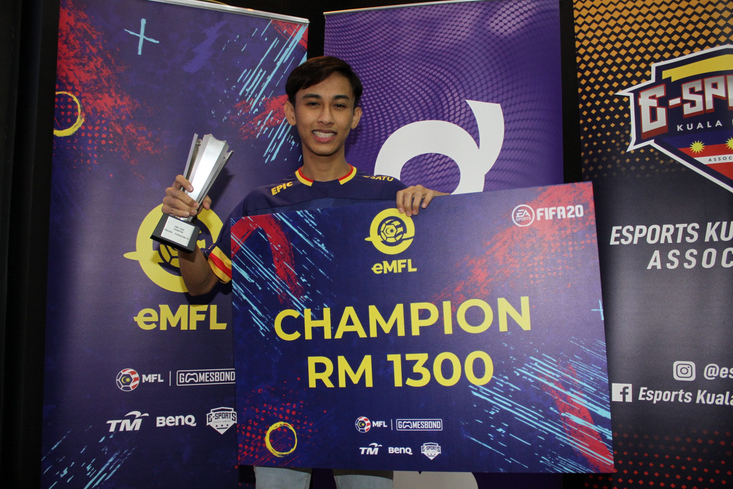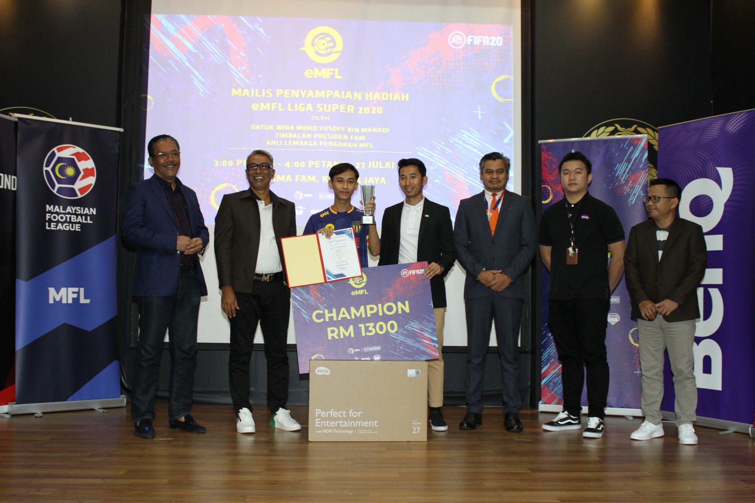 Dalam Majlis Penyampaian Hadiah eMFL 2020 hari ini, Mohd Faiz Hariry atau Favlain yang mewakili pasukan Terengganu FC dinobatkan sebagai juara dan berjaya membawa pulang hadiah wang tunai sebanyakk RM1,300, trofi, monitor permainan BenQ dan sijil penghargaan.