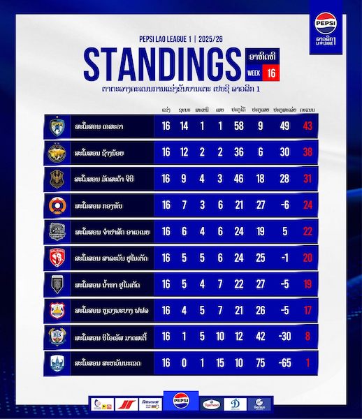 After 16 matches in the 10-team league, the defending champions have picked up 43 points – five ahead of second-placed Young Elephants FC.