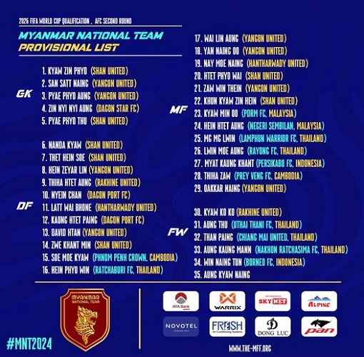 Out of the list of 35 players, 23 players are plying their trade in the Myanmar National League while the rest are playing for clubs across Southeast Asia.
