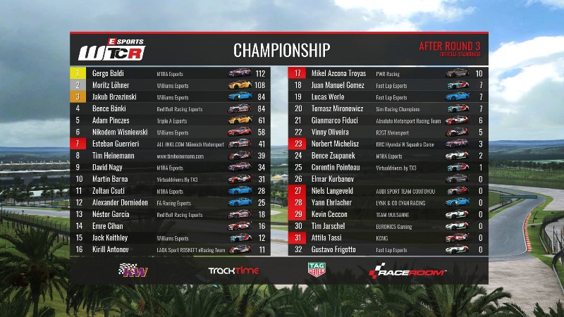 After six races, just four points split Hungary’s Gergo Baldi (M1RA Esports) and German Moritz Löhner (Williams Esports). Baldi races as Gabriele Tarquini in a Hyundai i30 N TCR with Löhner competing as Tom Coronel in a CUPRA TCR. The standings after round three are as follows: http://game.raceroom.com/