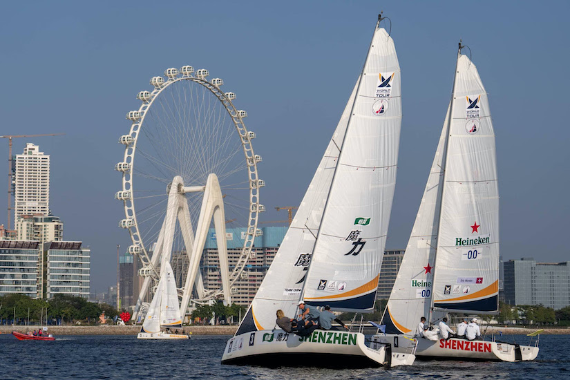 In the second qualifying group, five teams ended the day levelled on two wins from three races, including current women’s match racing world champion France’s Pauline Courtois and her Match in Pink Normandy Elite Team competing in Shenzhen for the first time.