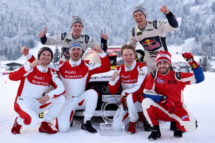 Four skiing aces and four other professional athletes accepted the challenge of the two-time DTM Champion Mattias Ekström to test his near-580-hp Audi S1 EKS RX quattro from the FIA World Rallycross Championship before the Hahnenkamm ski races. Two 367-hp Audi RS 3 Sportback* cars were available as well for fast laps on a course of snow and ice specifically prepared by Audi for this purpose. Two athletes each formed a team.