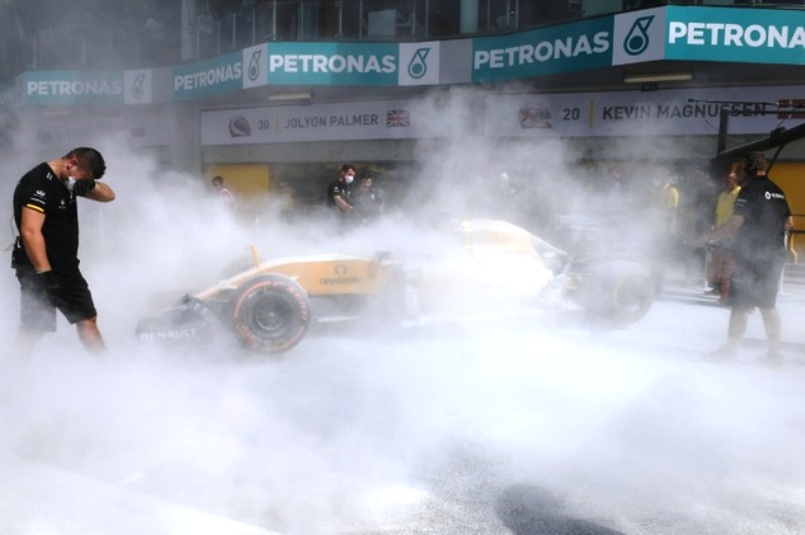 The first practice session for the Malaysian Grand Prix was halted in dramatic fashion after just 11 minutes on Friday when Kevin Magnussen’s Renault burst into flames in the pit lane.