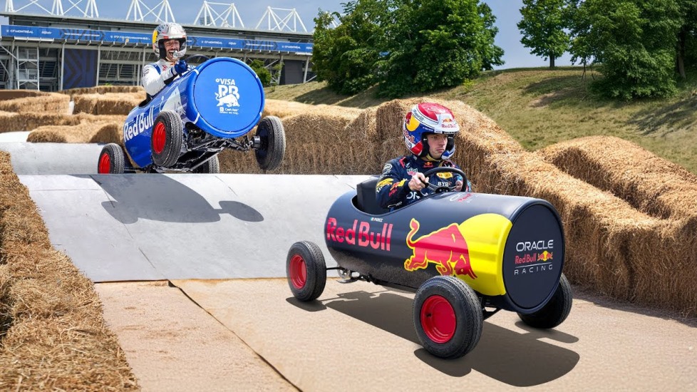 Formula One drivers try to finish on top, downhill: Max, Checo, Yuki and Daniel race soapboxes ahead of Canada GP.