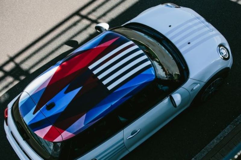 A particular highlight of the exterior is the roofās paint finish, which uses multiple colours. The roof graphic is applied meticulously by hand in several layers and brings together elements of Prince Harry and Meghan Markleās national flags ā the Union Jack and the Stars & Stripes. The special MINIās side scuttles around the side turn signal indicators have been 3D-printed and embellish the initials M and H with a heart and rings.