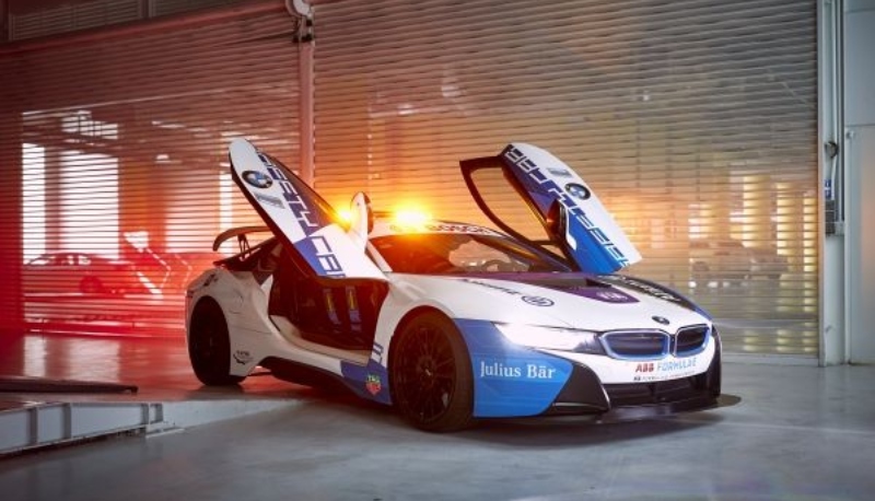 BMW i has been closely associated with Formula E as âOfficial Vehicle Partnerâ since Season One and has provided the entire fleet of safety vehicles ever since. The BMW i8 Coupe Safety Car has been modified with many BMW M components to cope with the specific demands of motor racing. These modifications include a roll bar, rear wing and rear hatch made of carbon fibre, a front splitter, sports seats from the BMW M4 GTS (combined consumption: 8.5 l/100 km; combined CO2 emissions: 199 g/km), four-point harness, a roof-mounted signal light system, BMW M carbon ceramic brakes and a sports chassis.