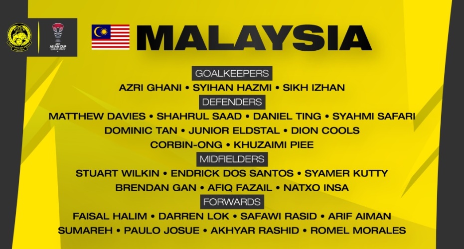 Berikut senarai akhir 26 pemain yang dipilih oleh ketua jurulatih kebangsaan, Kim Pan Gon bagi membarisi skuad Harimau Malaya membawa cabaran Malaysia pada kempen Piala Asia 2023 di Qatar, 12 Januari hingga 10 Februari 2024.