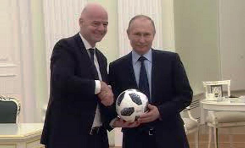 President Vladimir Putin played football with FIFA boss Gianni Infantino in the Kremlin on Tuesday as a festive Russia marked 100 days before the start of the World Cup.