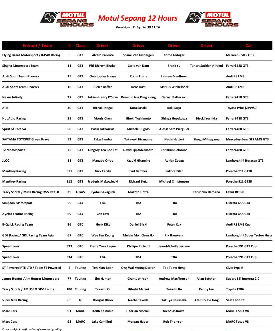 One week from the start of the 2016 Motul Sepang 12 Hours, the entry list for the Asian endurance classic is almost complete. The Motul Sepang 12 Hours is also the final round of the inaugural Intercontinental GT Challenge, and both the drivers’ and manufacturers’ titles are still up for grabs. Laurens Vanthoor is leading the driver standings, but Shane Van Gisbergen and René Rast are not far behind.