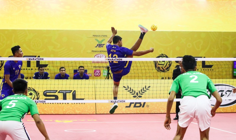 Walaupun beraksi dalam kecederaan, apit kanan veteran Khairudin Adenan tetap tampil dengan libasan bertenaga untuk membantu ATM Guardians mencatat kemenangan straight set 2-0 ke atas Melaka Titans dalam aksi Sepaktakraw League 2018, di Gem In Mall, Cyberjaya.