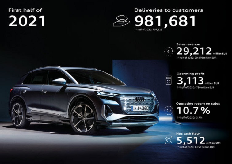 Record level of global vehicle deliveries Customers‘ continuing high level of interest in Audi models led to record deliveries in the first half-year: from January to June, the company delivered 981,681 Audi-brand automobiles to customers worldwide – a rise of 38.8 percent compared to the previous year (2020: 707,225). A total of 518,853 deliveries (2020: 354,232) also made the period from April to June the strongest quarter for sales in the company history. On the Chinese market,Audi reached its best-ever result in the first half with 418,749 deliveries (+38.4 percent). In the USA too, Audi achieved its best half-year, with 121,835 vehicles delivered (+59.9 percent). Momentum was also strong in Europe, with an increase of 32.7 percent (351,588 vehicles). Especially with all-electric and plug-in hybrid automobiles, the premium manufacturer recorded a significant increase, with some 80,000 deliveries, more than twice as many as in the same period of the previous year (2020: approx. 36,000). Furthermore, SUV models and the top-range vehicles experienced high growth rates. “Increased demand from our customers and the successful sales performance worldwide were strong drivers of growth in the first half-year. In this way we are continuing our successful development to become a leading provider of sustainable premium mobility,” says Hildegard Wortmann, Board Member for Sales and Marketing at AUDI AG. Electrification is moving ahead at the Four Rings: Audi is gradually phasing out production of combustion-engine vehicles up to 2033, and the company intends to be carbon-neutral by 2050 at the latest. The broadly based electric offensive will be consistently pushed forwards at the same time: with the new e-tron GT quattro1 and RS e-tron GT2 models, and the first all-electric car in the compact segment, Q4 e-tron and Q4 Sportback e-tron, the electric portfolio has expanded by four additional models. This means that, in the current year already, Audi is launching more electric than combustion-engine vehicles onto the market. By 2025 the company plans to have over 20 all-electric models in its range. Revenue higher than pre-crisis level In the first six months, the Audi Group increased sales revenue by 42.7 percent to €29,212 million (2020: 20,476 million). Compared to the previous year, marked by global lockdowns, turnover in the first half-year rose in all vehicle segments, accompanied by a favorable product and regional mix as well as good achievement of price goals. High demand for SUVs had a positive effect on revenue: Audi’s Q models were well received by customers in many markets, especially in the USA and in China. Revenue for the Lamborghini brand, at €961 million (2020: 766 million), was also higher than in the previous year. Operating return on sales within the strategic target range For the first half-year the Audi Group achieved operating profits amounting to€3,113 million (2020: -750 million). The operating return on sales in the first half rose to 10.7 (2020: -3.7) percent and therefore lies within the strategic target range of 9 to 11 percent. In addition to the strong performance in the core business and continuing cost discipline, the high level of profits and return on sales was reinforced by positive valuation effects especially for securing raw materials amounting to €0.9 billion compared to the previous year. For the first half of 2021, the Audi Group reports pre-tax profits of €3,875 million (2020: 86 million). This includes a high level of profit from financial items in the first six months at €762 million (2020: 836 million), reflecting particular healthy business in China. Net cash flow stood at €5,512 million (2020: 1,953 million), thus demonstrating that the Audi Group is financially robust and well positioned for the future. In addition to high profits and continued investment discipline, the Four Rings benefited from seasonal factors and effects carried over from the last quarter of 2020 with its high volume. Outlook for the full year: cautiously optimistic as before Looking at the whole of 2021, the company expects growing demand in global car markets. At the same time there are signs that the months ahead will also be marked by a critical supply situation for semiconductors. Audi continues to work intensely on counter-measures, but in view of the continuing shortage it is not expected to be possible to compensate in full in the course of the year for lost production. Furthermore, the Audi Group does not expect further substantial positive valuation effects from securing raw materials in the second half of the year. Nevertheless, the Four Rings take a cautiously optimistic view of the remaining months of the year: accordingly, the Audi Group expects vehicle deliveries of the Audi brand and sales revenue to be significantly higher than in the previous year. An operating return on sales in the planned range of between 7 and 9 percent is expected. Based on the positive trend of the first half-year and considering the higher seasonal expenditure in the second half, the Audi Group is adjusting its forecast for net cash flow to a figure between €4.5 and €5.5 billion. For further information, see here: Quarterly update and fact pack on first half of 2021 Selected key figures for Audi Group