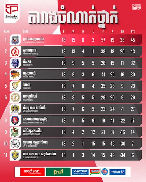 After 18 matches, defending champions Svay Rieng are at the top of the standings with 43, the same as former champions Crown.