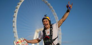 Two-time Red Bull King of the Air champion converts kite into parachute for Friday's impressive feat in UAE.