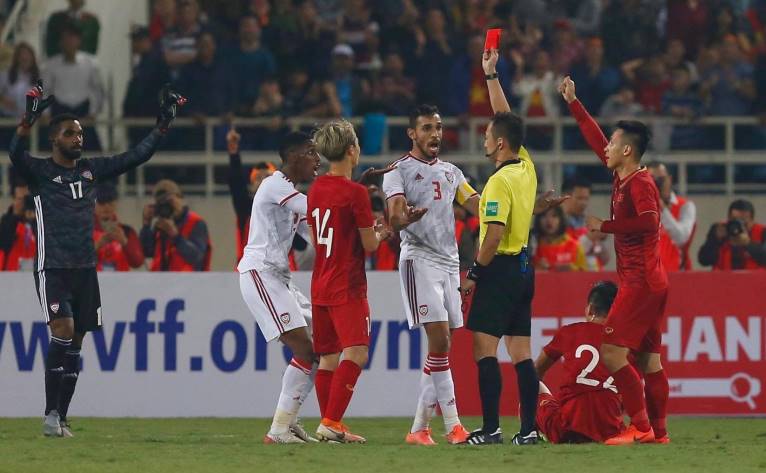 UAE had a man short in the 37th minute when defender Khalifa Al Hammadi was red-carded by Japanese referee Jumpei Iida following a foul on Nguyen Tien Linh.