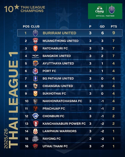In the meantime, Muangthong United are second with seven points, while Ratchaburi FC, third with the same number of points.