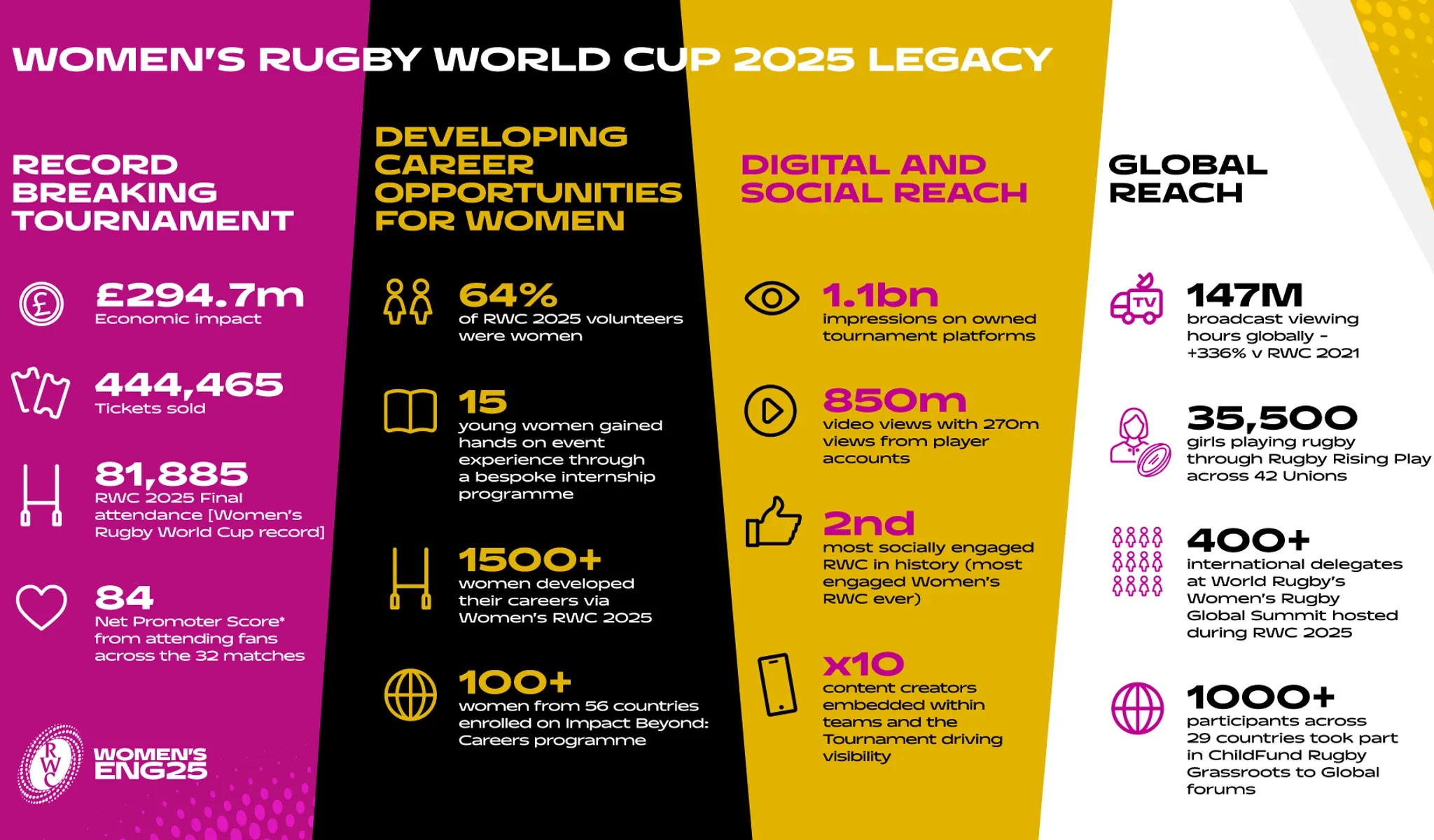 - A complete legacy picture: for the first time, World Rugby has provided a unified view of how Women’s RWC 2025 delivered transformational impact for the game both in England and across World Rugby’s member unions.